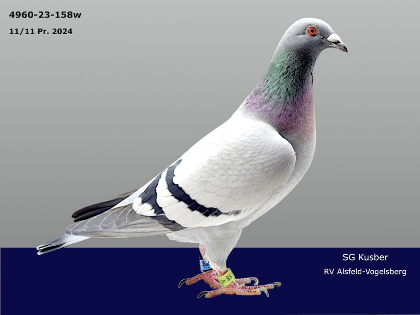 04960-23-158 W flog von 11 Einsätzen 11 Preise mit 3.742 Pr. Km und 639.50 AS-Punkten (darunter den 6. und 15. Konkurs) und wurde 2. RV bestes jähriges Weibchen. In 2023 wurde sie 18. beste Hessische Jungtaube und flog den 1. Konkurs von Rastatt am 02.09.2023. Sie stammt aus dem ebenfalls im Bericht schon erwähnten 09418-08-808, welcher in 2020 miit 12/12 bestes Männchen n der RV und FG wurde. Er ist Enkel aus dem 09418-97-794. Mutter des 808 ist die 02884-15-616W. Mutter der 158 W ist 02884-10-481 W von H. u. F. Sander eine Tochter aus dem JAAP.