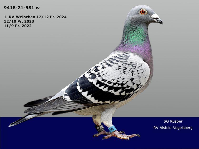 09418-21-581 W flog von 12 Einsätzen 12 Preise mit 3.899 Pr.Km und 775,32 AS-Punkten. Sie wurde RV bestes Weibchen. In 2023 flog sie von 12 Einsätzen 10 Preise mit 3.535 Pr.Km und 769,09 AS-Punkten. (darunter den 13. Konkurs). In 2022 als Jährige flog sie von 11 Einsätzen 9 Preise und als Jungtier von 4 Einsätzen 3 Preise (darunter den 18. Konkurs). Ihr Vater ist der im Bericht bereits mehrfach erwähnte 09418-16-441. Er ist aus dem Stammpaar 08978-08-201 von Peter Trost mit der Täubin 02884-15-616 von H. u. F.Sander. Seine Mutter ist die 09418-16-414 W. Sie stammt aus dem Sein im Bericht benannten AS-Vogel 09418-97-794. Dieser geht zurück von Karl Hesse und Dr. Linsen. Großvater des 794 war der 09418-92-651 1. AS Vogel im 25. Bezirk. Mutter der 414 ist eine Täubin von Albert Marcelis aux der Linie des Sprint.
