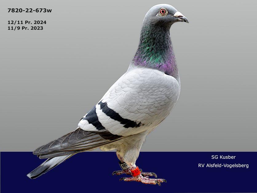 07820-22-673 W flog von 12 Einsätzen 11 Preise mit 3.712 Pr.Km und 828,18 AS-Punkten und wurde 2. RV bestes Weibchen. In 2023 als Jährige flog sie von 11 Einsätzen 9 Preise mit 2.988 Pr.Km und 722,22 AS-Punkten (darunter den 3. Konkurs) und wurde 3.Jähriges AS-Weibchen im Regionalverband mit 470,29 AS-Punkten. Ihr Vater ist ebenfalls der 09418-18-808. Ihre Mutter ist die 09418-16-443 W. Sie selbst flog in 2017 11/10 und ihre Schwester, die 444 W den 1. Konkurs im Regionalvervband 455 von Straubing gegen 7.800 Tauben. Mutter der 443 W eine Tochter aus dem Stammpaar von W. de Brujn sowie aus der Euro-Starline von H. u. F. Sander. Großmutter ist hier ebenfalls erwähnte 09418-11-414 W (Tochter aus dem AS-Vogel 794).