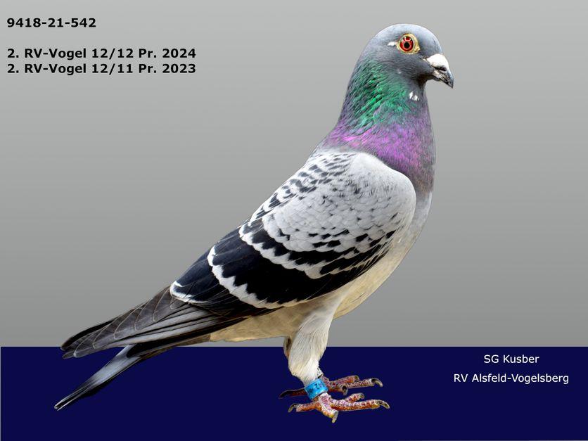 09418-21-542 flog von 12 Einsätzen 12 Preise mit 3.899 Pr.Km und 585.92 AS-Punkten (darunter den 5. Konkurs). Er wurde auch 2. RV bestes Männchen. In 2023 flog er von 12 Einsätzen 11 Preise mit 3.832 Pr. Km mit 493,20 AS-Punkten und wurde 2. RV bestes Männchen (darunter den 12. Konkurs). Als Jähriger er von 11 Einsätzen 7 Preise (darunter den 19. Konkurs) und als Jungtier von 3 Einsätzen 2 Preise (darunter den 5. Konkurs). Sein Vater ist der im Bericht bereits mehrfach erwähnte 09418-16-441. Er ist aus dem Stammpaar 08978-08-201 von Peter Trost mit der Täubin 02884-15-616 von H. u. F.Sander. Seine Mutter ist die 09418-11-414 W. Sie stammt aus dem Sein im Bericht benannten AS-Vogel 09418-97-794. Dieser geht zurück von Karl Hesse und Dr. Linsen. Großvater des 794 war der 09418-92-651 1. AS Vogel im 25. Bezirk. Mutter der 414 ist eine Täubin von Albert Marcelis aux der Linie des Sprint.