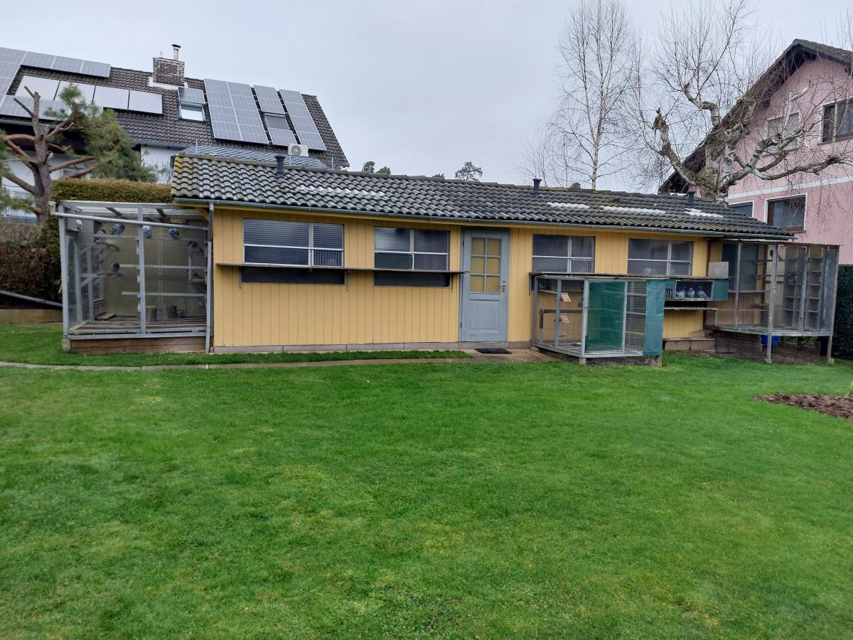 Ebenerdiger Gartenschlag 14 x 4 m unterteilt mit einem Abteil für die Zuchttauben, Jungtauben, Reiseweibchen und Reisevögel. Es gibt 3 Volieren, eine für die Zuchttauben, eine für die Reiseweibchen und eine für die Reisevögel sowie eine kleine Voliere für die Jungtauben.